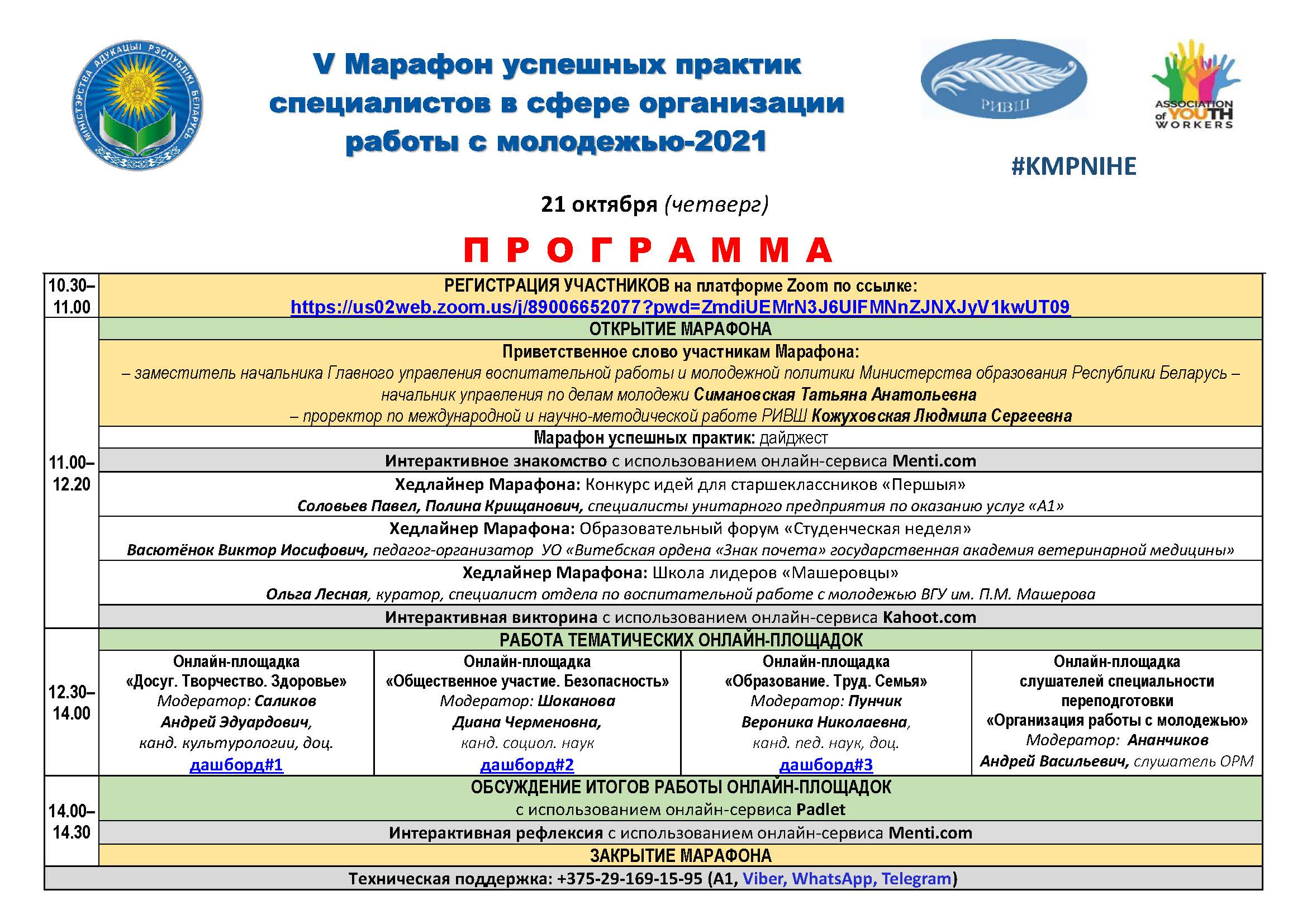 8 октября 2020 года при поддержке Министерства образования Республики Беларусь состоялся очный этап презентационного проекта «Марафон успешных практик специалистов в сфере организации работы с молодежью» (далее – Марафон) в on-line режиме на платформе Zoom.