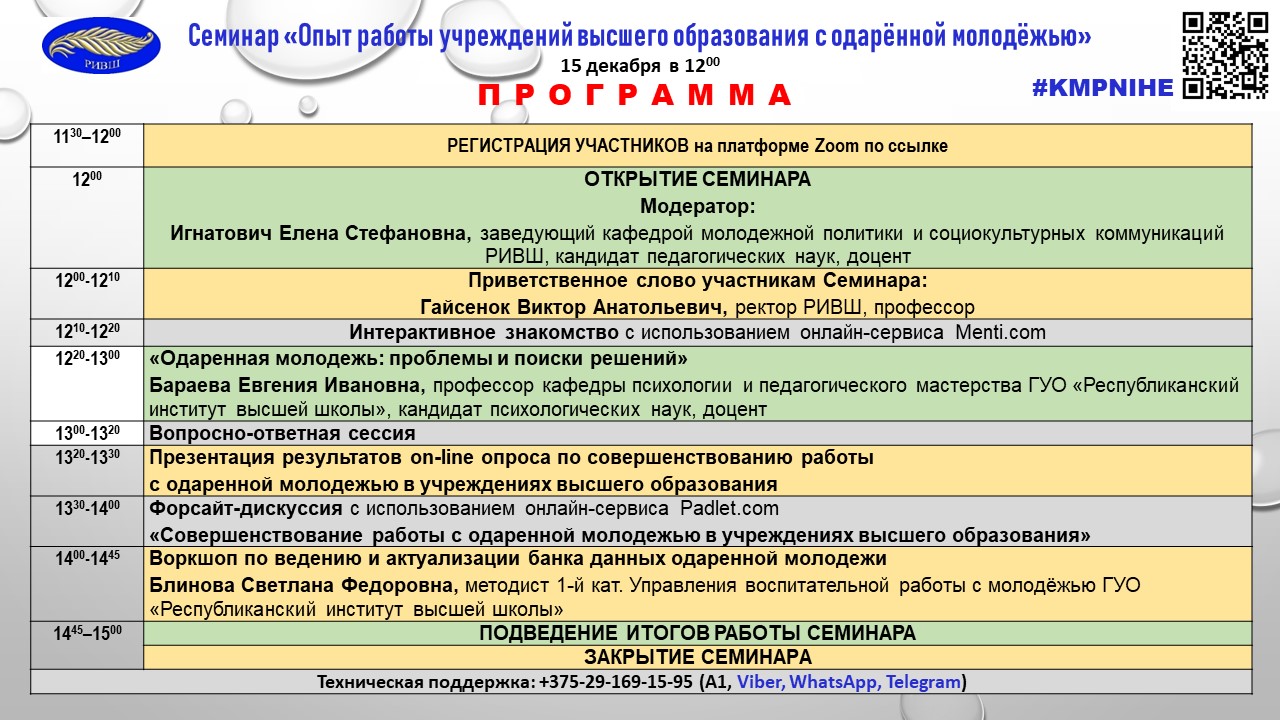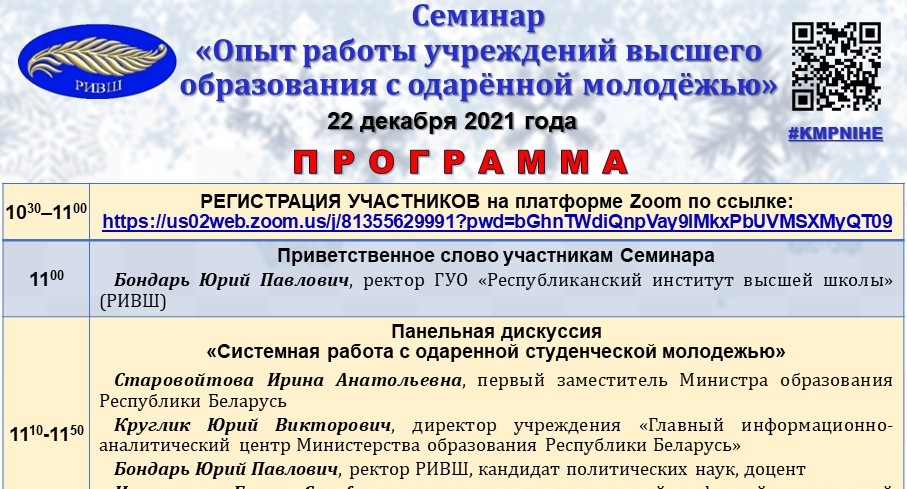 Кафедра молодежной политики и социокультурных коммуникаций ГУО «Республиканский институт высшей школы» 22 декабря 2021 г. провела ежегодный семинар «Опыт работы учреждений высшего образования с одаренной молодежью». Программа семинара включала панельную дискуссию, научно-методическую сессию и форсайт-дискуссию.